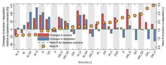 Domain-wide changes in total erosion and deposition volumes in relation to the baseline scenario as well as ratios between erosion and deposition volumes. Scenarios were sorted according to impact (from lowest to highest imbalance between erosion and deposition volumes). The notation of the scenarios is a combination of the individual driver notation listed in Table 2.
