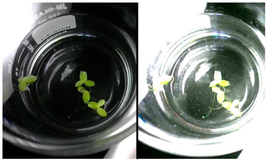 A test with the Lemna minor was performed according to the ISO 20079 standard (Water quality—Determination of the toxic effect of water constituents and waste water on duckweed (Lemna minor)—Duckweed growth inhibition test) as a 168 h growth inhibition test [4]. The observed endpoint was growth inhibition by the effect of the samples during a 7-day exposure (168 h). The aim of the test was to quantify the negative effects on vegetative growth in two parameters—the number of leaves and the leaves-occupied area. Then, it was possible to compare these two evaluation approaches.