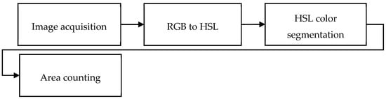 After the image acquisition, the image was converted from the RGB (red, green, blue) image color space to the HSL (hue, saturation, value) color space. In the HSL color space, it is easy to determine which pixels of the image have a green hue (the leaves), thus the HSL color segmentation can be done. After the color segmentation, we can see the white mask in the image, which determines the area occupied by the leaves (Figure 4).