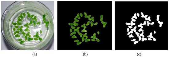Original image (a), image of segmented leaves (b), image of the mask of the leaves (c).