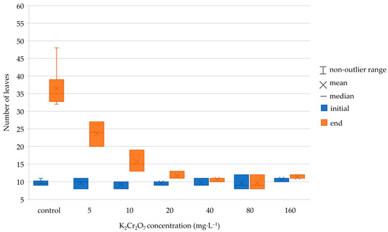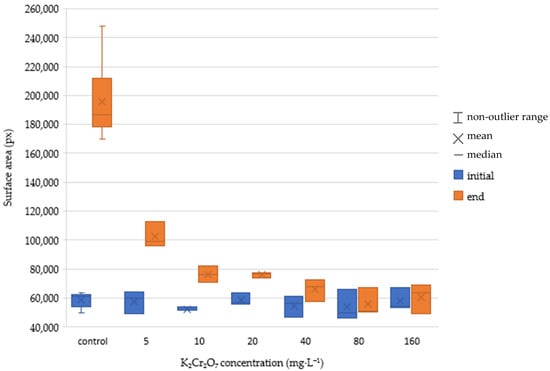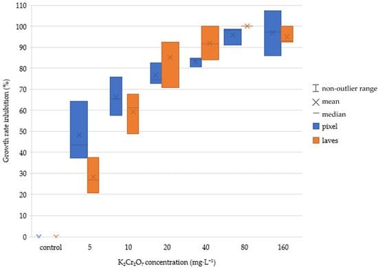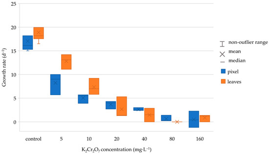 The numerical results of the tests after 168 h exposure are shown in Table 2 and Table 3. Unfortunately, we were not able to maintain the recommended temperature of 24 °C during the test, which caused lower growth rate values in the control than required by the ISO standard. However, it was still possible to compare the two methods of evaluation. The method using image processing showed significantly higher values of growth inhibition, especially at the lowest tested concentrations. A box and whisker plot representation of the result is in Figure 5, Figure 6, Figure 7 and Figure 8. There are significant differences in growth rate and growth rate inhibition, especially at concentration values 5 and 10 mg·L−1. This could be attributed to the fact that low concentration of the toxic substance did not yet have much impact on the number of leaves grown but rather on their size. The differences in concentrations between 20–160 mg·L−1 were not so significant. In both evaluation methods, higher K2Cr2O7 concentrations caused higher growth rate inhibition (number of leaves and pixels). In case of lower toxic concentrations, using the area counting method may lead to more accurate measurements.