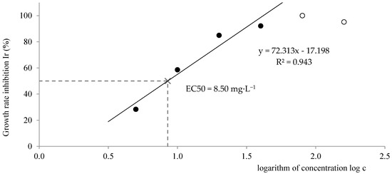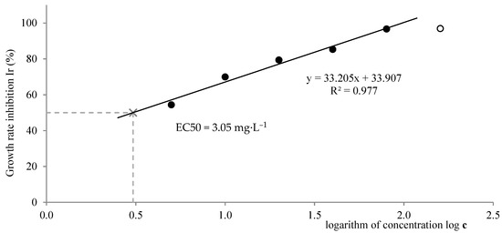 Figure 9 and Figure 10 depict the evaluation of EC50 by both methods. Only the values of growth rate inhibition that are lower than 100% have to be used for the calculation, therefore the regression line consists only of these values (black points on the graph). According to the leaves counting method, the EC50 had a value of 8.50 mg·L−1, which lies within the expected range. According to the image processing method, the EC50 was 3.05 mg·L−1, which is slightly below the mentioned range. A lower value of EC50 means higher toxicity. It can be concluded that the toxic effect was more significant in the case of the leaves-occupied area than in the case of the number of leaves.