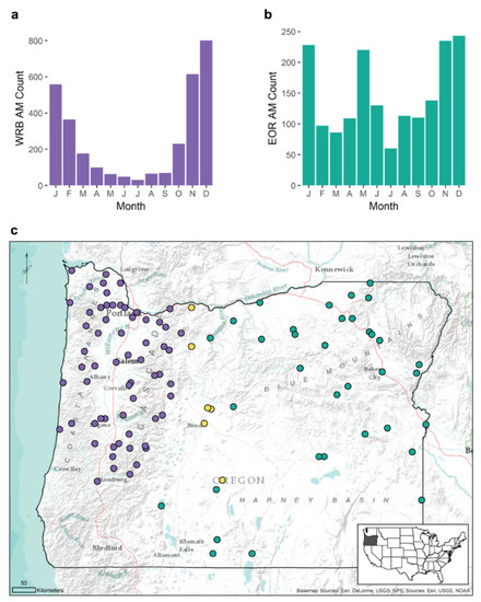 Figure 1. Study regions with location reference numbers, and annual maxima (AM) climatology where (a) is the count of AM events by month for the Willamette River Basin (WRB) and (b) is the count of AM events by month for the eastern Oregon (EOR) study region. Within the study region map (c), the purple markers indicate locations included exclusively within the WRB, while green markers indicate those within the EOR. The yellow markers are the locations that were included within both study regions. Basemap Source: ESRI [44].