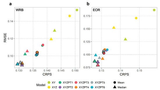 Figure 2. Comparison of mean and median continuous ranked probability score (CRPS) and root mean squared error (RMSE) for (a) the WRB region and (b) the EOR region. The top performing three or four models are closely clustered where one may perform better with respect to CRPS, while another may have a slightly better RMSE. The top performing models across both mean and median results in (a) are XYZPT2, XYZPT4, XYZPT5, and XYZPT6, while the top performing in (b) are XYZPT1 and XYZPT3.