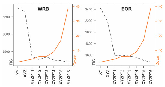 Most noticeable of all is the difference in the ξ PIP of the more complex models in comparison with those of the simpler models. While the simpler models had negligible to near-negligible ξ PIP, these more complex models display higher ξ PIP with more variability across covariates. For model XYZPT5 (Figure 5a,b), it generally appears that precipitation of wet-season months tends to have a higher ξ PIP for both regions; the exception to this being the May precipitation ξ PIP of the WRB XYZPT5 model. Model XYZPT6 (Figure 5c,d) mirrors the ξ PIP results for monthly P seen in XYZPT5 for the WRB region and has the same distribution but with higher PIPs for the EOR region. The EOR XYZPT6 model (Figure 5d), unlike the better performing EOR models, has a relatively high ξ PIP for elevation, Td, and T.