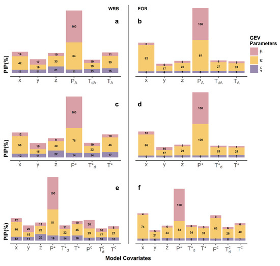 Figure 4. Posterior inclusion probability for the GEV location, inverse scale, and shape parameters (μ, κ , ξ ) for the three simpler models. Model XYZPT3 for (a) the WRB and (b) EOR, model XYZPT2 for (c) the WRB and (d) EOR, and model XYZPT4 for (e) the WRB and (f) EOR. For all models and regions, the uppermost color (pink) represents μ, the middle color (orange) displays the results for κ , and the bottommost color (purple) shows the results for ξ .