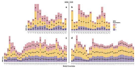 Figure 5. Posterior inclusion probability for the GEV parameters (μ, κ , ξ ) for the two most complex models. Model XYZPT5 for (a) the WRB and (b) EOR, and model XYZPT6 for (c) the WRB and (d) EOR. For both models and regions, the upper-most color (pink) represent μ, the middle color (orange) displays the results for κ , and the bottom-most color (purple) shows the results for ξ .