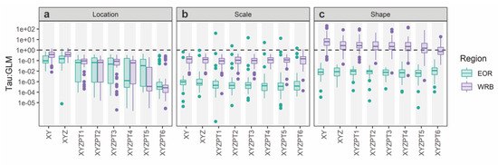 The τ term contribution to the shape parameter for the EOR sites is much lower than that of the WRB sites (Figure 6c). For the majority of the WRB sites, the contribution of the τ term exceeds that of the GLM term, in some cases by a large proportion (y-axis in log scale). This could indicate that there are additional covariates not included in this study that influence the shape of the GEV distribution within the WRB. The main difference in shape parameter PIP results between model XYZPT6 and the other models, for both regions, is the large increase in the contribution of T and Td. The XYZPT6 model had the lowest τ contribution of all the models for the WRB with a median contribution less than 1:1, indicating that including monthly T and Td was beneficial. However, in the EOR region, the XYZPT6 model has a greater median τ term contribution to the shape parameter relative to all other models. This is the only potential indication of a τ term contribution link with the EOR predictive performance results where XYZPT6 was among the worst models.
