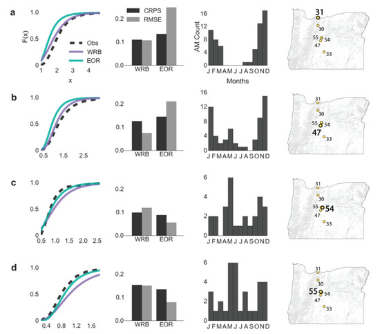 For the locations east of the Cascade Range, which were included in both regions (hereafter referred to as “overlapping stations”), the AM temporal distribution of each station appears to correspond well with which region’s models performed best at that location (Figure 7 and Figure S5). This could be due to the different storm climatology; in the WRB winter storms dominate and most AM events occur during November–February, while in the EOR early summer (May–June) thunderstorms are also prominent. The WRB models performed better than the EOR models at stations 31 and 47 (Figure 7a,b, also station 30 in Figure S5), which have more AM events occurring between December and January and resemble the AM temporal distribution for the pooled WRB data (Figure 1a). The EOR model performed better at stations 54 and 55 (Figure 7c,d, also station 33 in Figure S5), which also have a relatively large number of AM falling between May and June (in addition to the expected winter storms of the Pacific Northwest region) and correspond with the AM temporal distribution for the pooled EOR data (Figure 1b). These results suggest that accounting for the dominate storm mechanisms that influence the AM temporal distribution within the pooled station data of the model may improve predictive performance.