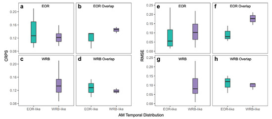 Figure 8. Comparison of station specific CRPS (ad) and RMSE (eh) versus AM temporal distribution by region. EOR (a,e) and WRB (c,g) display the quantiles of station-specific model performance when stations (excluding overlapping stations) are categorized by EOR-like or WRB-like AM temporal distributions. EOR overlap (b,f) and WRB overlap (d,h) display the same performance versus categorization for the overlapping stations only, using the EOR and WRB models’ results, respectively.