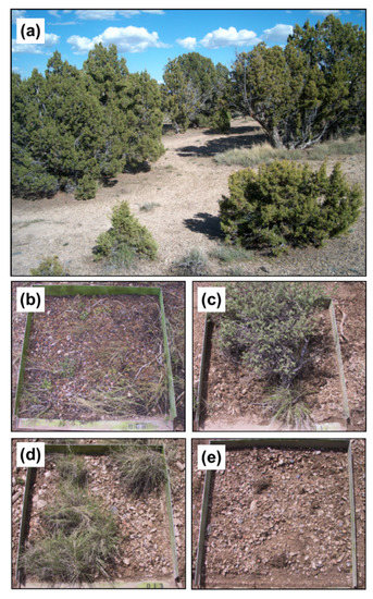 Photographs of the Onaqui site in this study showing: (a) the common woodland vegetation structure on sagebrush (Artemisia spp.) shrublands in the later stages of woodland encroachment, with isolated tree islands and an extensive sparsely-vegetated intercanopy between trees; (b) the typical litter-covered ground surface within the subcanopy underneath trees (subcanopy patch); and (c) shrub, (d) vegetated interspace (≥30% herbaceous cover), and (e) bare interspace (<30% herbaceous cover) microsites typical of areas within the intercanopy patches between trees. Photographs (b–e) are of rainfall simulation plots used in previous studies at the Onaqui site [18].