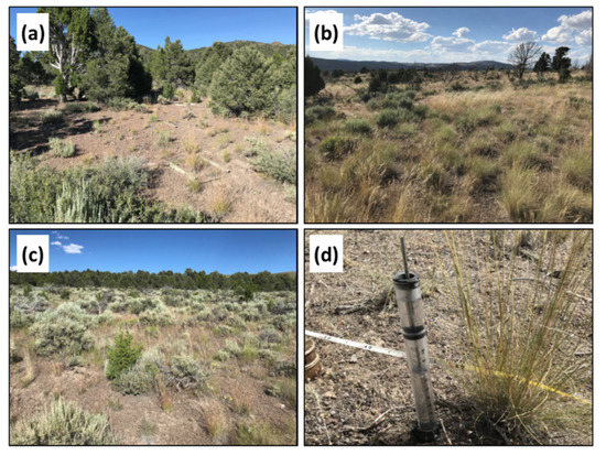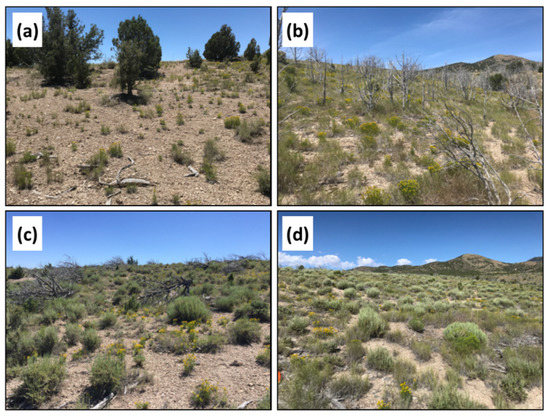 The sagebrush (Artemisia spp.) steppe vegetation type represents one of the most extensive, ecologically important, and imperiled rangeland ecosystems in the world [1,2,3]. Sagebrush shrublands historically occupied more than 620,000 km2 throughout western North America and currently inhabit less than 60% of that previous range [3,4]. Where intact, sagebrush shrublands provide critical plant and wildlife habitats, cultural resources, forage for wild and domestic ungulates, recreation opportunities, and the retention of water and soil resources [3]. The widespread encroachment of native pinyon (Pinus spp.) and juniper (Juniperus spp.) conifers (woodland encroachment) at upper elevations (moist and cool sites) have transitioned more than 170,000 km2 of sagebrush shrublands to wooded shrublands and pinyon–juniper woodlands [5,6]. Pinyon and juniper encroachment on sagebrush shrublands is attributed to multiple factors including intensive grazing, reduced fire frequencies, climate variability, and atmospheric CO2 enrichment [5,7,8], which is consistent with the drivers of woody plant encroachment on other water-limited lands around the world [9,10,11]. The conversion of sagebrush steppe to a wooded shrubland or woodland commonly results in reduced understory vegetation and forage [12,13,14], loss of critical wildlife habitats [15], and increased bare ground, runoff, and soil erosion [16,17,18,19,20,21]. At warmer and drier elevations, the exotic annual cheatgrass (Bromus tectorum L.) readily invades bare patches on degraded sites and homogenizes the spatial fuel structure [4,22,23,24,25]. Cheatgrass is highly flammable, increases the frequency of wildfire, and readily re-occupies and dominates burned sites [4,24,25,26,27]. The frequent re-burning of cheatgrass-invaded sites thereby promotes a recurring grass–fire cycle that perpetuates cheatgrass dominance [23,25] and potentially increases long-term soil loss associated with repeated burning [28,29,30]. Mid-elevation warm and dry sagebrush sites are susceptible to woodland encroachment and subsequent invasion by fire-prone cheatgrass, with cheatgrass commonly increasing over time with ensuing amplified fire activity [8,31,32,33,34]. The risks of severe wildfire and post-fire cheatgrass dominance are particularly high for mid-elevation woodlands with dense woody fuels and for wooded shrublands with well-connected horizontal and vertical fuel layers [5,8,35].