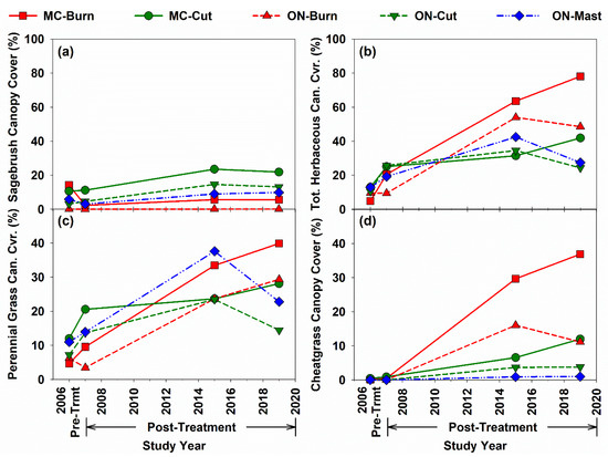 Canopy cover of sagebrush (Artemisia spp.) shrubs (a), total herbaceous cover (all grasses and forbs) (b), perennial grasses (c), and the invasive annual cheatgrass (Bromus tectorum L. (d)) measured in burn (Burn), cut (Cut), and mastication (Mast; Onaqui site only) treatment areas at the Marking Corral (MC) and Onaqui (ON) study sites immediately before the treatments (2006, Pre-Trmt) and 1 year (2007), 9 years (2015), and 13 years (2019) after the treatments (Post-Treatment).