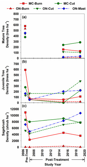 Density of mature live trees (≥1 m height) (a), juvenile live trees (<1 m height) (b), and live sagebrush (Artemisia spp.) shrubs (c) as measured in burn (Burn), cut (Cut), and mastication (Mast; Onaqui site only) treatment areas at the Marking Corral (MC) and Onaqui (ON) study sites immediately before the treatments (2006, Pre-Trmt) and 1 year (2007), 9 years (2015), and 13 years (2019) after the treatments (Post-Treatment).