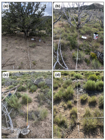 Tree transects at each site were oriented in a due east compass direction from the tree bases unless obstructed by neighboring tree canopies or other natural obstacles (e.g., bedrock). Transects in the control areas (Figure 6) at each site extended to the intercanopy mid-point between the nearest tree neighbor along the due east compass direction. In cases of overlapping canopy areas or obstacles in the eastward direction, the respective transect was oriented in a due west compass direction. In the case of an obstacle or canopy overlap in both the east and west directions, a new tree was randomly selected and the above transect establishment methods were repeated. East and west orientations were selected to avoid contrasting micro-climates typical of north- and south-facing canopy aspects for pinyon and juniper conifers [95]. Transects in the treated areas were selected and designed to be consistent with those in the control areas, but the total transect length in the treated areas in which the subcanopy areas were indistinguishable was determined as the average of the transect lengths from the respective site control transects. The average distances from a tree base to the subcanopy edge across all the experimental areas ranged from 1.4 m to 2.0 m at Marking Corral and 1.4 m to 1.7 m at Onaqui. The average total transect distances across all the experimental areas ranged 2.3–2.6 m at Marking Corral and 3.4–3.7 m at Onaqui.