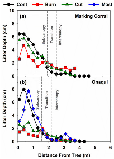 Litter depths measured at sampling points spanning the subcanopy (areas from the tree base extending to an existing or previously existing canopy drip line), transition (area immediately adjacent to the canopy drip line), and intercanopy (area immediately adjacent to the transition zone and outside of the tree canopy) zones along tree transects in the control (Cont), burned (Burn), cut (Cut), and mastication (Mast, Onaqui site only) treatment areas at the Marking Corral (a) and Onaqui (b) study sites in 2019, 13 years after treatment applications.