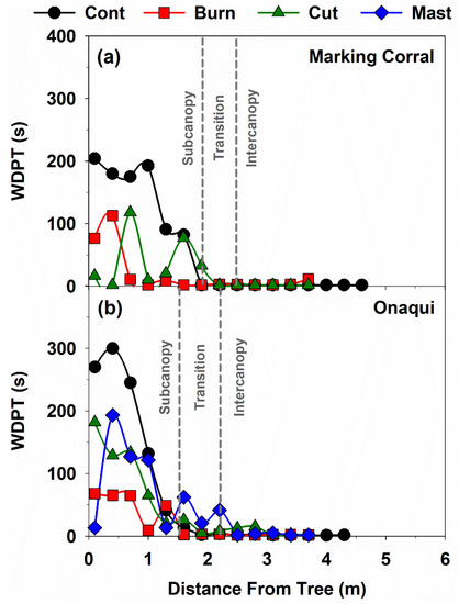 Soil water repellency at the mineral soil surface as assessed by water drop penetration time (WDPT) tests at sampling points spanning the subcanopy (areas from the tree base extending to existing or previously existing canopy drip line), transition (area immediately adjacent to the canopy drip line), and intercanopy (area immediately adjacent to the transition zone and outside of the tree canopy) zones along the tree transects in the control (Cont), burned (Burn), cut (Cut), and mastication (Mast, Onaqui site only) treatment areas at the Marking Corral (a) and Onaqui (b) study sites in 2019, 13 years after treatment applications. Soils are considered wettable where the WDPT < 5 s, slightly water repellent where the WDPT ranges between 5 and 60 s, and strongly water repellent where the WDPT > 60 s. WDPT tests were limited to 300 s in this study, yielding a maximum possible WDPT = 300 s.