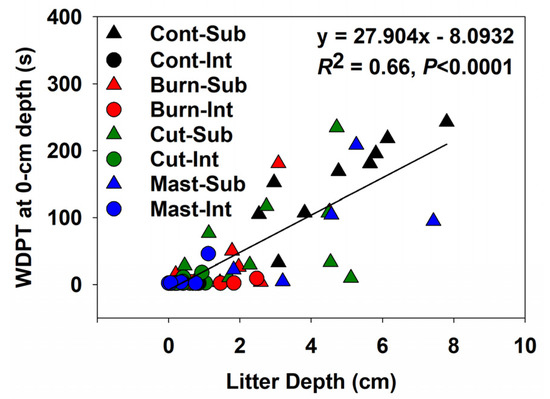 Relationship of soil water repellency with litter depth at the mineral soil surface as assessed by the water drop penetration time (WDPT) tests in the intercanopy (Int) and subcanopy (Sub) patches of the tree transects in control (Cont), burned (Burn), cut (Cut), and mastication (Mast, Onaqui site only) treatment areas at the Marking Corral and Onaqui study sites in 2019, 13 years after treatment applications. Soils are considered wettable where the WDPT < 5 s, slightly water repellent where WDPT ranges between 5 and 60 s, and strongly water repellent where the WDPT > 60 s. WDPT tests were limited to 300 s in this study, yielding a maximum possible WDPT = 300 s.