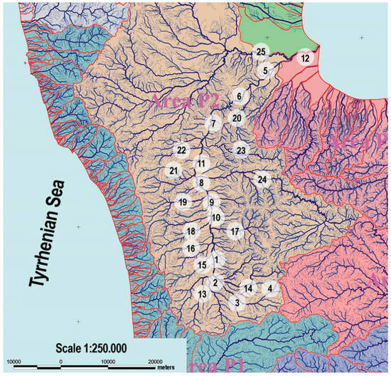 The sampling sites were distributed along the Crati River as follows: four at the river head (samples Crati13, Crati15, Crati16, Crati17), seven located downstream of the purifier (samples Crati2, Crati3, Crati4, Crati7, Crati8, Crati9, Crati10) and 14 at the mouth of the river (samples Crati1, Busento, Cardone, Campagnano, Emoli, Arente, Settimo, Annea, Galatrella, Finita, Turbolo, Duglia, Mucone, Coscile). These sampling sites correspond to the long-term monitoring sites of the Regional Agency for the Environment of Calabria and were therefore selected according to the protocol detailed in the Dlsg N. 60/2000 [22]. The geographical area and the sampling sites are reported in Figure 1.