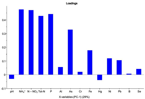Two data sets were built, respectively, for water and sediment samples. Each set was built using 30 analytical parameters per site, for a total of 750 values. Firstly, a selection of the variables carrying the most useful information was made. This selection represents a critical step that must be carefully considered, because the exclusion of important variables can lead to misleading results in building the model. The amount of relevant information does not necessarily increase when multiple variables are included, indeed, random noise may even increase. Figure 2 shows the bar plot of the loadings, describing the different contributions of each variable in building the principal components. The importance of the different variables for the components is here evident.