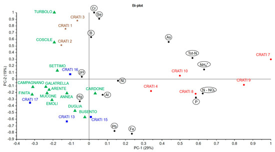 The bi-plots reported in Figure 3 and Figure 4 enable the identification of the main characteristics of the sampling points through a simultaneous evaluation of the chemical–physical parameters. This allows for a clearer and more immediate evaluation with respect to the interpretation of the data of Table 2 and Table 3, which is usually difficult to carry out because the variables are evaluated one at a time.