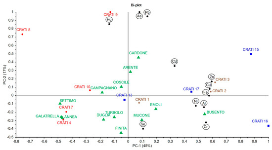 The analysis of sediment showed less correlation between the samples and geographic location. However, through PCA and the graphical reports (bi-plots), it was possible to outline a distribution of the withdrawal points on the risk map. In particular, PC1 (49% EV) contained information relating to cadmium, zinc, copper, iron, aluminum, nickel and chromium, with a cluster of samples characterized by high concentrations of these parameters in Crati 2, 3, 15, 16, 17 and Busento. PC2 (17% EV) described the cluster of the samples Arente, Cardone, Crati 8, 9 and 15 as having higher values of mercury, arsenic and lead. The Crati 8 and Cardone sites had high values of mercury and Crati 9 a concentration of lead above the allowed limits. The analyzed data showed that the limits established by the environmental quality standards reported in the Decree 260 of 08/11/2010 were exceeded only with regard to the analysis of metals.