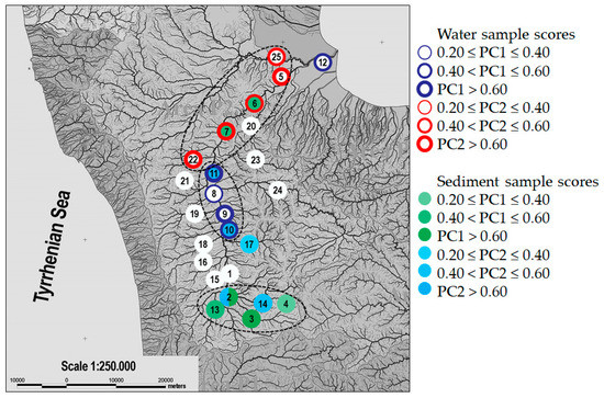 The water and sediment withdrawal sites were colored according to the values of the PC1 and PC2 scores [31]. PC1 in water monitoring (29.0% of explained variance, EV) showed higher positive loading values for nitrogen, P and As content, by identifying a corresponding cluster of samples in the risk map. Samples near the river source and the main tributary channel have similar characteristics regarding ammonium, total nitrogen, chromium and nickel, which remain at relatively lower values than in the other sampling points. For the withdrawals along the Crati Valley, Crati 4, 7, 8, 9 and 10, similar values are obtained for the arsenic, total nitrogen, ammonia, phosphorus and nickel parameters, with values above average (Figure 5). Information stored in PC2 (19% EV) grouped the samples collected at the mouth of the river, Crati 1, 2, 3, Coscile and Turbolo, have similar concentrations of total chromium, selenium and boron. It should be noted that, in this territorial area, the tributaries have similar characteristics to the sites near the river mouth, probably due to the fact that the effluent withdrawals were also made downstream and therefore can be enriched or contaminated by the same pollutants. This type of pollution could be due to anthropogenic activities in the sampling sites studied. In fact, in this area, it was possible to detect the presence of construction sites, agricultural crops and landfills.