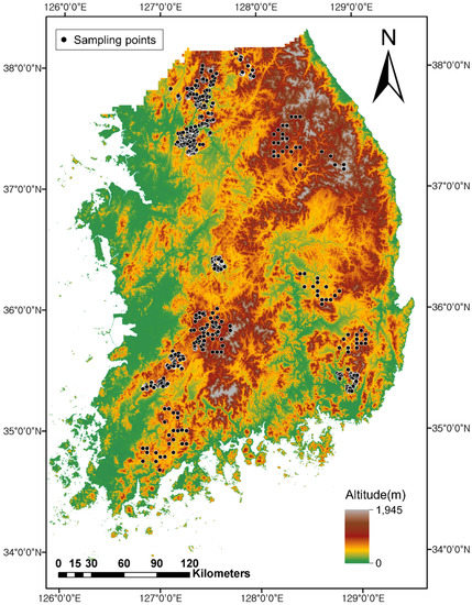 This study was conducted on forest soil throughout South Korea, and 1456 soil samples were collected from 731 sites with topsoil and subsoil for the investigation (three replications of each soil horizon, Figure 1). When the forest soil was sampled, the litter and humus layer was removed. After that, topsoil was collected at the horizon depth of 10 cm, and subsoil was collected at the horizon depth of 30 cm. South Korea is located at about 33 to 38 degrees latitude and 125 to 129 degrees longitude, and in the humid temperate climate zone. It is also affected by the continental air mass from the northern continent and the oceanic air mass because three sides of the whole country are surrounded by the sea. The mean annual precipitation is about 1343 mm, and most of the rainfall is concentrated in June to September. The average temperature in summer is about 23 to 25 degrees Celsius, so it is hot and humid, but the average temperature in winter is about −1 to 1 degrees Celsius, so it is cold and dry. Considering this, there are a large mean annual range of temperature and four distinct seasons.
