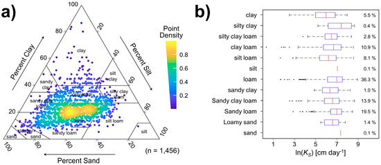 (a) Distribution of forest soils used in this study (n = 1456) across USDA textural classes and (b) ranges of the saturated hydraulic conductivity () and percent database by soil texture class.