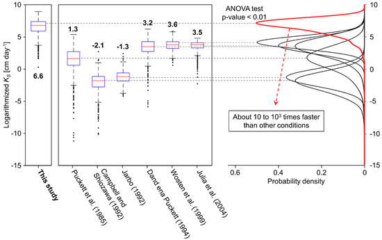 Six PTFs were analyzed to confirm the difference between the of the forest soil collected in this study and the predicted by the PTFs in previous research. The was calculated using 1456 soil physical characteristics as input factors for the PTFs in previous research. Six PTFs did not focus on the forest soil, and many previous studies were based on various land use types. There was also no clear information about land use types. Figure 3 also shows the predicted from the PTFs in previous research and measured in this study. Figure 3 shows the range of the logarithmized on the left side and its probability density function on the right side.