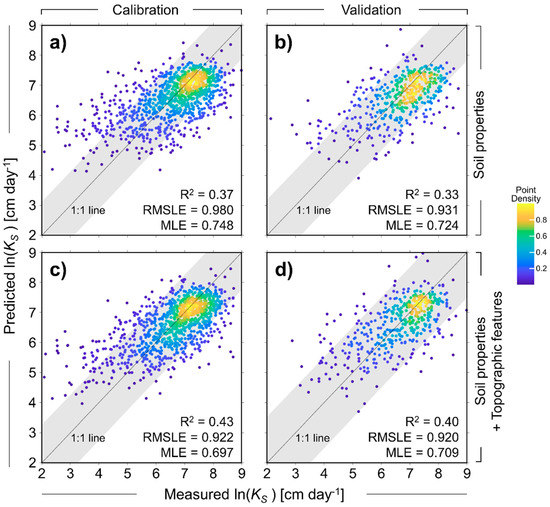 where n is the number of observation samples, is the measured saturated hydraulic conductivity, is the predicted value from the PTFs, and is the mean of the measured values. The RMSLE and MLE represent the differences between the measured and predicted values as absolute values, and the lower the performance of the model, the higher the values. The RMSLE is directly affected by the scale factor and reacts more sensitively to outliers than the MLE. is the dimensionless value that represents the correspondence between the measured data and the predicted data. This has a value between 0 and 1, and variables are more correlated as the nears 1.
