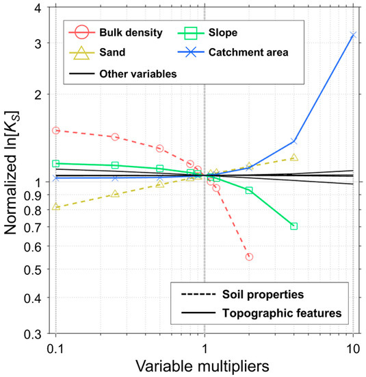 Each explanatory variable was varied by total 10 multipliers: 0.1, 0.25, 0.5, 0.8, 0.9, 1.1, 1.2, 2, 4, and 10. Each variable was multiplied while the others were kept constant. Moreover, the multiplied variable was used as the input variable in PTFs, and the output, which was the modified saturated hydraulic conductivity, was normalized (modified /non-treated ) to determine the amount of change. A sensitivity run was only implemented once for the PTF model, because there was no variance between the output of each sensitivity run.