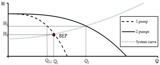When two or more pumps were installed in parallel, the increasing of flow rates were obtained (Figure 2). The operating point () represented a higher volumetric flow rate than a single pump for a consequence of greater system head loss, and the volumetric flow rate was lower than twice the flow rate achieved by using a single pump (). All of these changes can influence the system efficiency.
