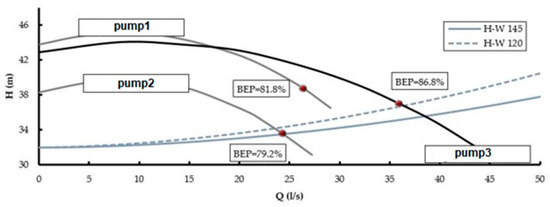 Then, in a pump system design, several pumps which fitted the considered flow and head ranges can be selected, such as the practical application presented in Figure 3.