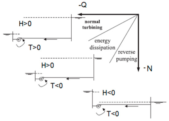 For normal turbine operation, the rotating speed () and discharge () were negatives and the head () and torque () were positives (Figure 4).