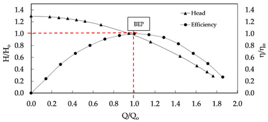 The characteristic curves in the dimensionless form (Figure 10) were constructed based on a rated condition associated with the best efficiency point. The dimensionless curves provided a tool to transfer information to other equivalent systems.