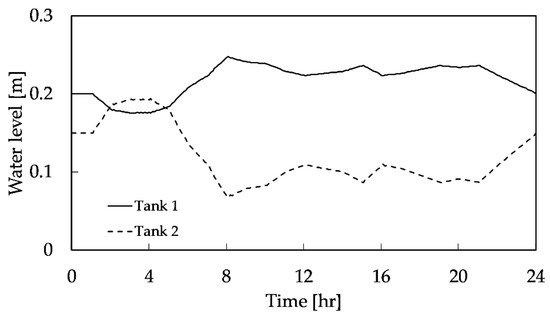 Despite the previous case of having a balance of flow rate in the whole system and constant water levels in tanks, the water level in both tanks changed with time, as shown in Figure 15. The water level variations in T-1 and T-2 were correlated, decreasing in T-1, in turbine mode and increasing in T-2, in pump mode, in a controlled optimized way between the maximum and minimum limits for tank water levels (Figure 15).