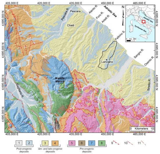 Geological sketch map of the northeast (NE) Abruzzo. Black line: The Feltrino Stream basin. Legend: post-orogenic deposits—(1) fluvial deposits (Holocene), (2) fluvial and alluvial fan terraced deposits (Middle–Late Pleistocene); sin-and late-orogenic deposits, (3) clay, sand, and sandstone of hemipelagic sequences with conglomerate levels (Early Pleistocene), (4) pelitic–arenaceous turbiditic foredeep sequences (Late Miocene–Early Pliocene); pre-orogenic deposits, (5) marl–clay–limestone of the Molise pelagic sequences (Oligocene–Miocene), (6) limestone of carbonate ramp facies (Early Miocene–Early Pliocene), (7) limestone and marl of slope and pelagic basin sequences (Cretaceous–Miocene), (8) limestone of carbonate platform sequences (Jurassic–Miocene); (9) major thrust (dashed if buried); (10) major normal fault (dashed if buried); (11) major fault with strike–slip or reverse component (dashed if buried).