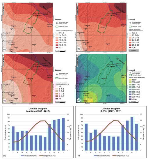 Climatic setting of the study area and the surrounding region. White dots in the map (realized through the Kernel Interpolation function) show the temperature and rainfall gauges, while the green line is the Feltrino Stream basin. (a) Average annual temperature; (b) average temperature of the warmest (July) month; (c) average temperature of the coldest (January) month; (d) average annual rainfall; (e) climatic diagram of the Lanciano gauge (1987–2017); (f) climatic diagram of the S. Vito–C.le Capuano gauge (1987–2017).
