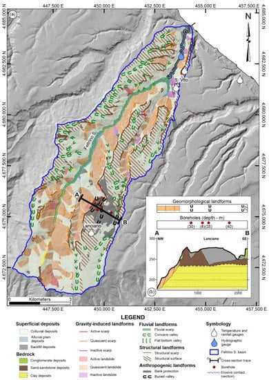 This configuration of the hilly piedmont area is bounded to the east by a cliffed coast, interrupted by the main alluvial valleys (e.g., Sangro River, Pescara River) and sharp valleys and gorges of the minor streams (e.g., the Feltrino Stream) incised on the mesa-plateau-cuesta relief (on mainly clay-dominated low permeability bedrock). The main active geomorphological processes in the area are fast fluvial processes along the valley floors (flash floods), and fast soil erosion processes (surface runoff, gully, rill, and sheet erosion), as well as slow (roto-translational, complex) to fast (rock falls, flows) landslides on the valley sides. These processes affect the basins mainly during heavy rainfall events [33,44,45,46,47,48,49,50], and flooding events affect either the main valley floors and alluvial plain areas, or the minor valleys or the anthropically modified drainage lines in urban areas.