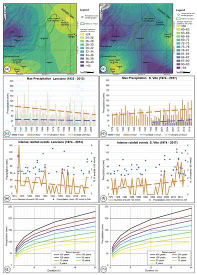 Maximum precipitation distribution in the study area. (a) Distribution of average maximum rainfall over 1 h; (b) distribution of average maximum rainfall over 24 h; (c) diagram of the maximum precipitation over 1 h and 24 h in each year (Lanciano 1932–2009); (d) diagram of the maximum precipitation over 1 h and 24 h in each year (S. Vito 1974–1995 S. Vito Chietino; 1996–2017 S. Vito–C.le Capuano); (e) diagram of the intense precipitation and number of intense events (>55 mm/24 h) of the Lanciano gauge (1974–2013); (f) diagram of the intense precipitation and number of intense events (>55 mm/24 h) of the S. Vito gauges (1974–1995 S. Vito Chietino; 1996–2017 S. Vito–C.le Capuano); (g) precipitations return periods (1–24 h) for the Lanciano gauge (Gumbel distribution); (h) precipitations return periods (1–24 h) for the Lanciano gauge (lognormal distribution).