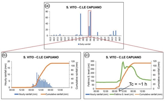 (a) Daily rainfall of February–March 2015; (b) hourly and cumulative rainfall of 4–6 March 2015 in the S. Vito–C.le Capuano gauge; (c) hourly and cumulative rainfall of March 2015 event in the S. Vito–C.le Capuano gauge, the hydrographic level of the Feltrino S. (Feltrino–S. Vito gauge; for the gauges’ locations, see Figure 4), and relative time of concentration (Tc).