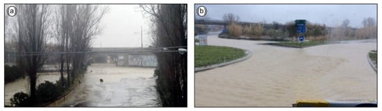 Some effects of the 2015 heavy rainfall event: (a) Feltrino Stream flooded out of the banks in its terminal part and mouth area, and flooded a parking area [91]; (b) flooded roads [92].