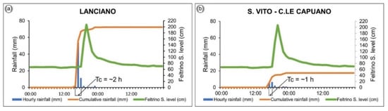 Hourly and cumulative rainfall, and the hydrographic level and time of concentration (Tc) of the Feltrino Stream (Feltrino–S. Vito gauge), during the event of June 2018; (a) Lanciano gauge; (b) S. Vito–C.le Capuano gauge (for the gauges’ locations, see Figure 4).