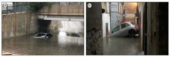 Cars were stranded after the June 2018 flash flood in the urban area of Lanciano: (a) near the industrial area of Lanciano, in the southern area of the municipality; (b) in the historic center of Lanciano.