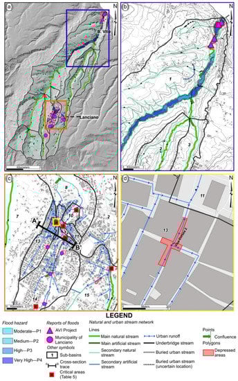 Data used for the flood critical areas map through the geomorphology-based matrix. (a) Flood hazard [58], reports of floods [59,72], and the natural and urban stream network of the Feltrino Stream basin. (b) Enlarged view of the Feltrino Stream sea mouth (purple box in Figure 10a). (c) Natural and urban stream network of the municipality of Lanciano (orange box in Figure 10a). (d) The Vico Corsea 2 critical area, in the historic center of Lanciano (yellow box in Figure 10c). Critical areas a and c (in the red boxes) represent the sites of Figure 9a,b, respectively.