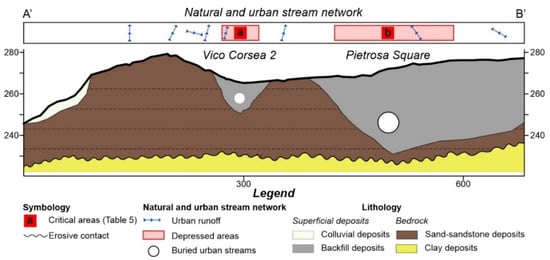 As an example, one of the main critical areas in the historical center of Lanciano (Vico Corsea 2; Figure 10d; a in Table 5) is a closed depression ~7 m deep (from ~270 to 263.4 m a.s.l.) where all of the surrounding streets and related urban runoff converge. The draining system cannot cope with the discharge that occurs during heavy rainfall, and the site is frequently flooded (Figure 9b). Another particular case (Pietrosa Square; b in Table 5) is a depression ~15 m deep, with steep slopes. Below this site, the ancient course of the Pietrosa Stream flows in a buried urban stream. Backfill deposits buried the original valley for more than 30 m. This stream course (sub-basin 14) flows into a buried urban stream below the city center of Lanciano (sub-basin 11 and 12) and flows out in the northern part of the urban area, inside the Malsano Stream, connecting sub-basin 14 with sub-basin 10 and 8.