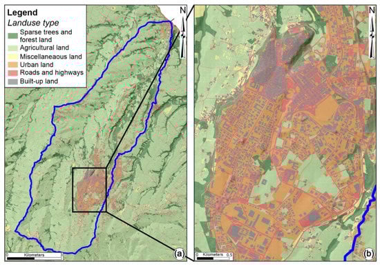 Land-use map. (a) Feltrino Stream basin; (b) detail of the urban area of Lanciano. Blue line: Feltrino Stream basin.