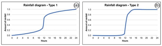 Furthermore, a detailed simulation of the urban area of Lanciano was performed. In this simulation, due to the lack of LiDAR data in the Lanciano area, the 5 m DTM was used, and a 5 m cell size was set for the model. Two rainfall distributions were used for the simulations, according to the significant rainfall events that occurred in recent decades. One is one day long and moderately intense; the second is a few hours long and more intense. More specifically, the following events were used: (1) a 24 h long event with a total rainfall of 110 mm and moderate intensity (5–10 mm/h) and the highest at the middle hours (representing the 2015 heavy rainfall event, which occurred in the area); (2) a 4 h long event with a total rainfall of 75 mm and a high-intensity spike (55 mm/h) in the second hour (representing the 2018 event, which occurred in Lanciano).