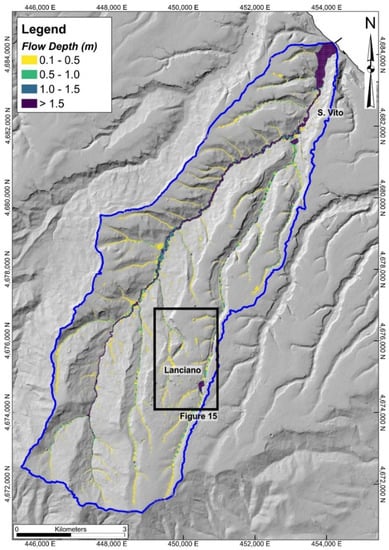 On 22 June 2018, a heavy rainfall event affected, for a short time (~4 h), the Feltrino Stream basin, and especially the municipality of Lanciano. This event was characterized by a cumulative rainfall of ~75 mm in 4 h but was highly concentrated (~55 mm in 1 h and ~68 mm in 3 h, from 16:00 to 19:00; Figure 8a) in the Lanciano area. The return period of this event was from 30 years (55 mm/1 h) to 16 years (75 mm/4 h; Figure 5g,h). Moderate rainfall occurred on the coastal area of the Feltrino basin (~5 mm/h with a cumulative ~17 mm, S. Vito; Figure 8b). A storm with these characteristics (rainfall ≥55 mm in 1 h) was recorded at least 8 times over the 86-year time series (Figure 5c). The time of concentration (Tc), from the Lanciano rainfall gauge to the Feltrino–S. Vito hydrometric gauge was empirically calculated to be ~70 min. Tc from the S. Vito–C.le Capuano to the Feltrino–S. Vito hydrometric gauges resulted in ~46 min. These values are short due to the small basin size and were confirmed by the shifting of the hourly/cumulative rainfall and hydrographic level graphs for this event (Figure 8). The graph outlines Tc = ~2 h from the Lanciano rainfall gauge to the Feltrino–S. Vito hydrometric gauge, and Tc = ~1 h from the S. Vito–C.le Capuano rainfall gauge to the Feltrino–S. Vito hydrometric gauge. For this event, the Tc values confirm the typical characteristics of a flash flood.